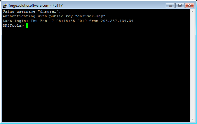 Simply double-click dnstools in the Saved Sessions list box. A mostly black terminal window will appear and look similar to below. Congratulations, you are now connected to the DNS Tools server!